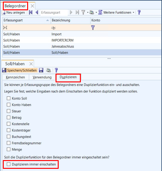Die Einstellung dazu nehmen Sie im entsprechenden Belegordner vor („Stammdaten / Weitere Stammdaten / Belegordner“). Dabei können Sie wählen, ob das Duplizieren nur für die aktuelle Erfassungsgruppe aktiviert werden soll oder ob diese Funktion beim Aufruf der Erfassungsgruppe immer eingeschaltet ist.