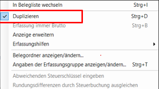 Es ist möglich, bestimmte Belegangaben des zuletzt erfassten Belegs in den nächsten Beleg der Erfassungsgruppe zu übernehmen. Sie können dabei selbst entscheiden, welche Belegangaben dupliziert werden sollen.