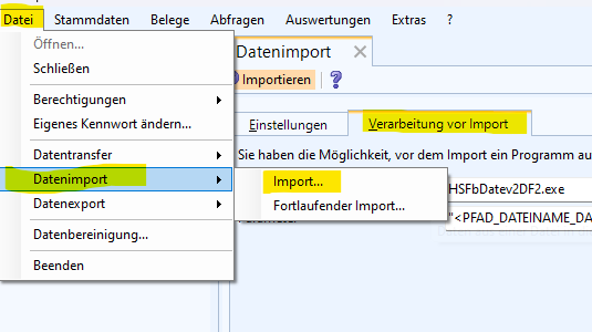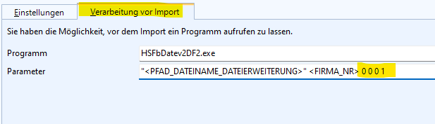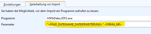 Dazu können Sie unter Datei / Datenimport auf der Registerkarte Verarbeitung vor dem Import bestimmte Parameter zur DATEV oder anderen Importdateien mit Platzhaltern hinterlegen.
