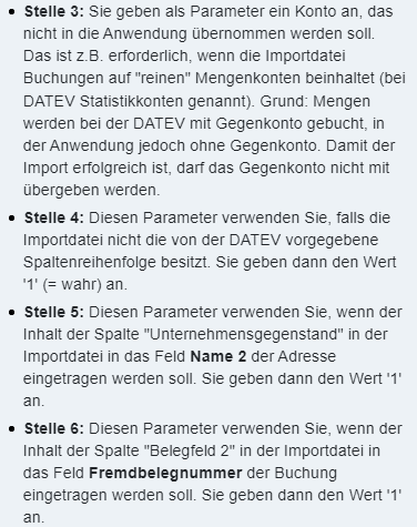 Für die Fremdbelegnummer ist nur die Stelle 6 erforderlich. Sie verwenden diesen Parameter, wenn der Inhalt der Spalte Belegfeld 2 in der Importdatei in das Feld Fremdbelegnummer der Buchung eingetragen werden soll. Sie geben dann den Wert 1 an.