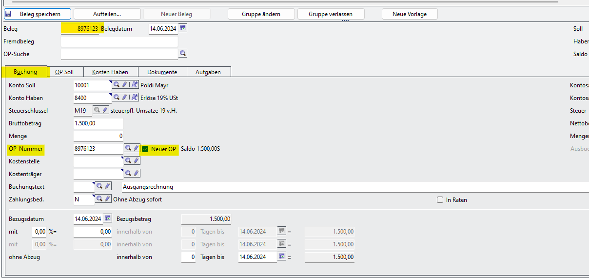 Die Vorbesetzung für die OP-Nummer ist die Belegnummer.
