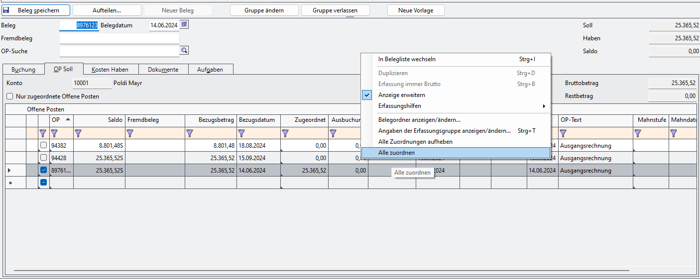 Wenn Sie einen Rechtsklick im Reiter OP ausführen können Sie mit dem Befehl Alle zuordnen alle Offenen Posten zum Ausgleich auswählen.