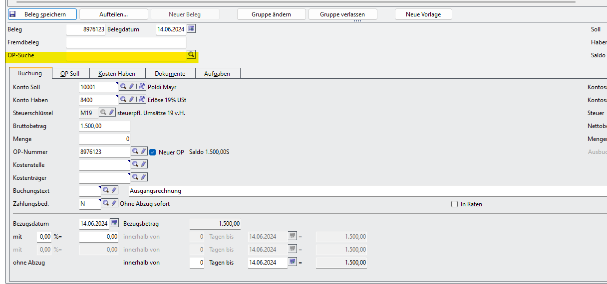 Auf der Registerkarte Buchung geben Sie die OP-Nummer eines einzelnen Offenen Postens ein: