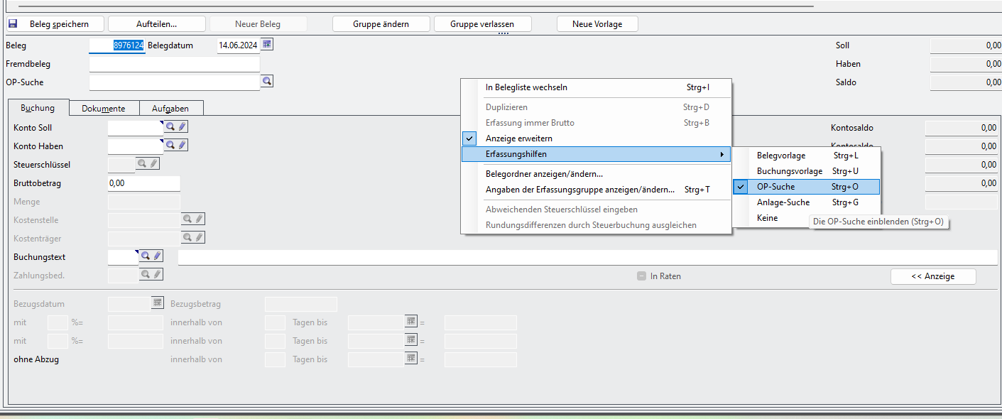 Wenn dieses Feld nicht im Belegkopf sichtbar ist, führen Sie einen Rechtsklick aus. Nun wählen Sie unter Erfassungshilfen den Punkt OP-Suche mit einem Klick aus.