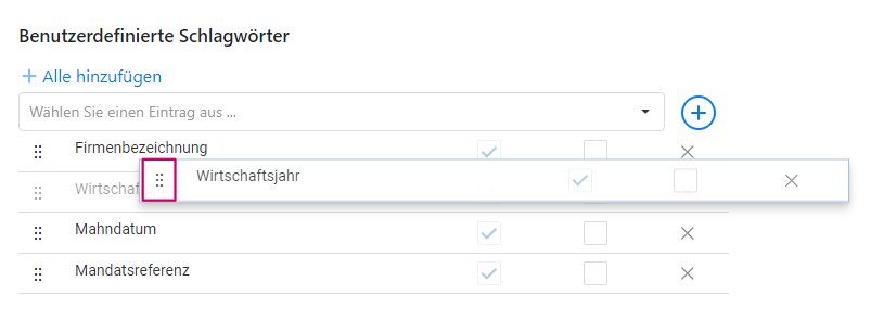Sie haben die Möglichkeit, die Reihenfolge dieser benutzerdefinierten Schlagwörter individuell für die Oberfläche der Eingabemaske in HS Rechnungsprüfung anzupassen.