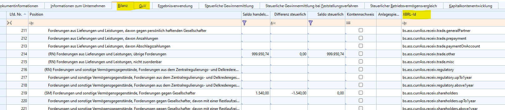 - Beginnt Ihre Position mit bs., handelt es sich um die Bilanz. Beginnt sie mit is.net, handelt es sich um die Gewinn- und Verlustrechnung.