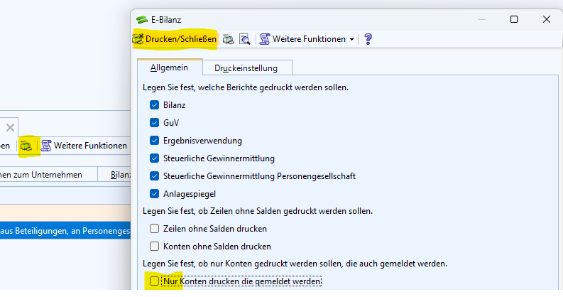 - Achten Sie darauf, dass Sie den Haken bei "Nur Konten drucken die gemeldet werden" entfernen.