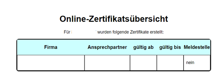 Die Abbildung zeigt welche Informationen von der ITSG bereitgestellt werden. In der Online-Zertifizierungsübersicht der ITSG wird auch angezeigt, ob Ihre Firma als Meldestelle hinterlegt wurde.