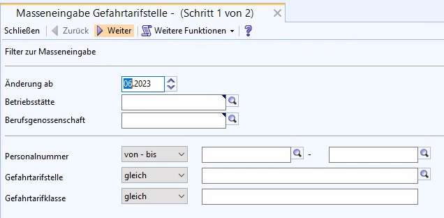 Im zweiten Schritt geben Sie die neue Gefahrtarifstelle bzw. Gefahrtarifklasse an, verfeinern ggf. noch die Mitarbeiterauswahl und führen dann die Änderung für die ausgewählten Mitarbeiter durch.