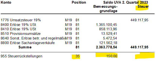 Hier sehen Sie ein Konto, welches in der Position 35 steht. Wenn dies so korrekt ist, prüfen Sie bitte, ob Sie dazu eine manuelle Steuerbuchung haben. In dem Fall muss auch im Steuerkonto eine UVA-Zuordnung stehen. Wenn das Konto wirklich steuerfrei ist und nicht in die Umsatzsteuervoranmeldung soll, öffnen Sie bitte das Sachkonto unter den Stammdaten.