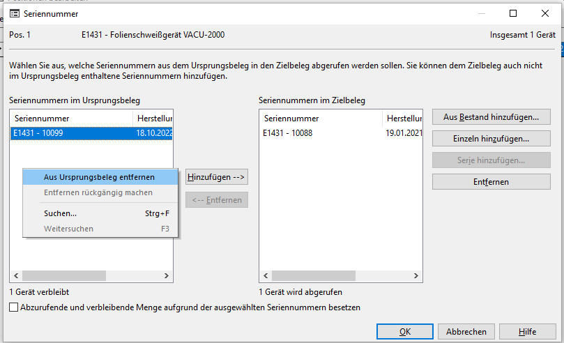 HS Auftragsbearbeitung bietet Ihnen die Möglichkeit bei einem Abruf die Serien- oder Chargennummer aus dem Ursprungsbeleg zu entfernen.