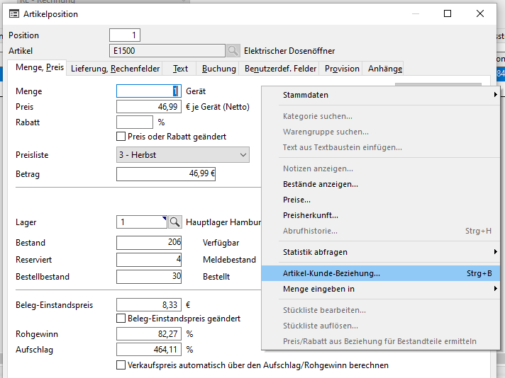 1. Sie können jederzeit über das Kontextmenü die Funktion aufrufen, dass eine Artikel-Kunde-Beziehung angelegt werden soll.