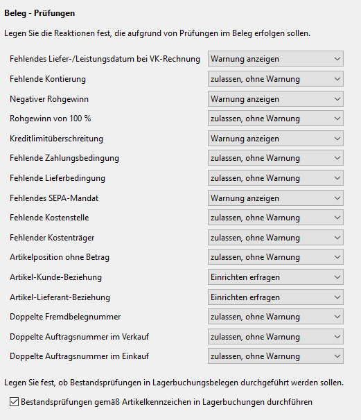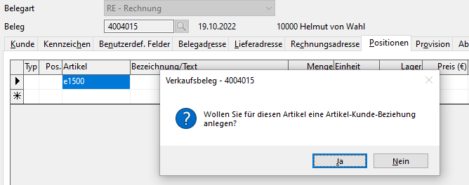 Ist hier eingestellt, dass das Einrichten einer Beziehung erfragt werden soll, dann erhalten Sie bei der Belegbearbeitung einen entsprechenden Hinweis.