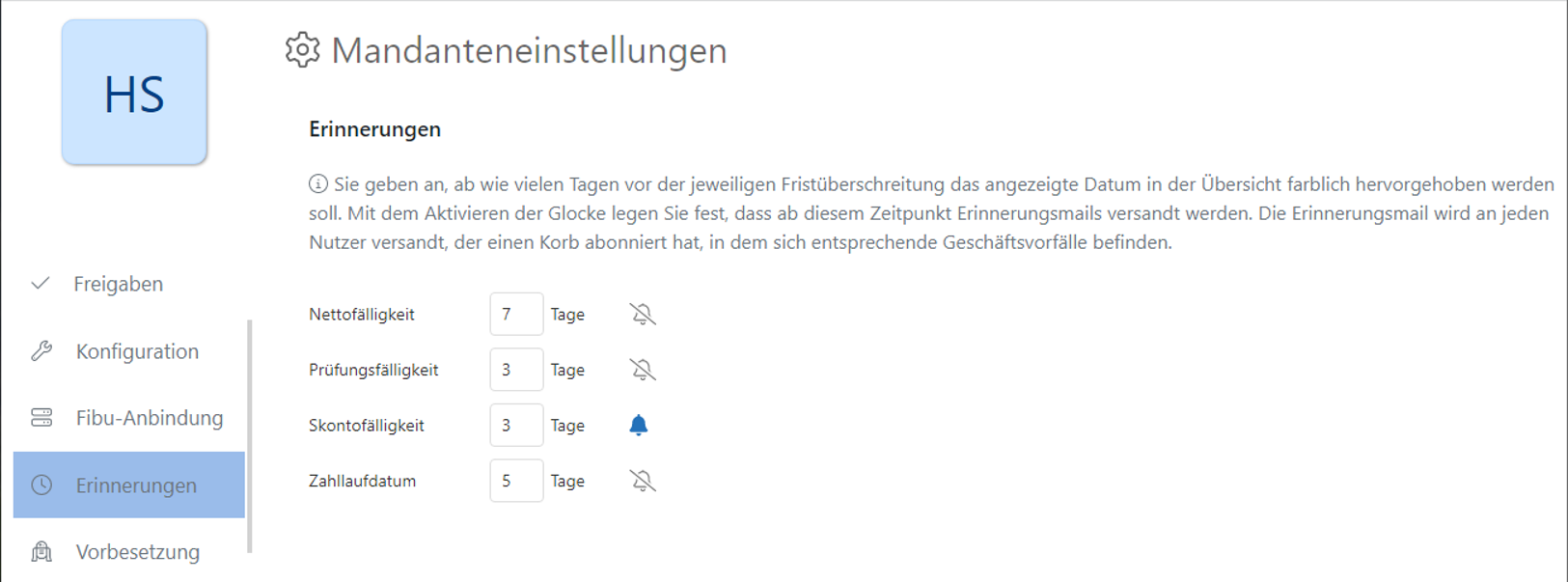 Hier legen Sie die Erinnerungsfristen und die E-Mail-Benachrichtigung zu den Fälligkeitsdaten fest.