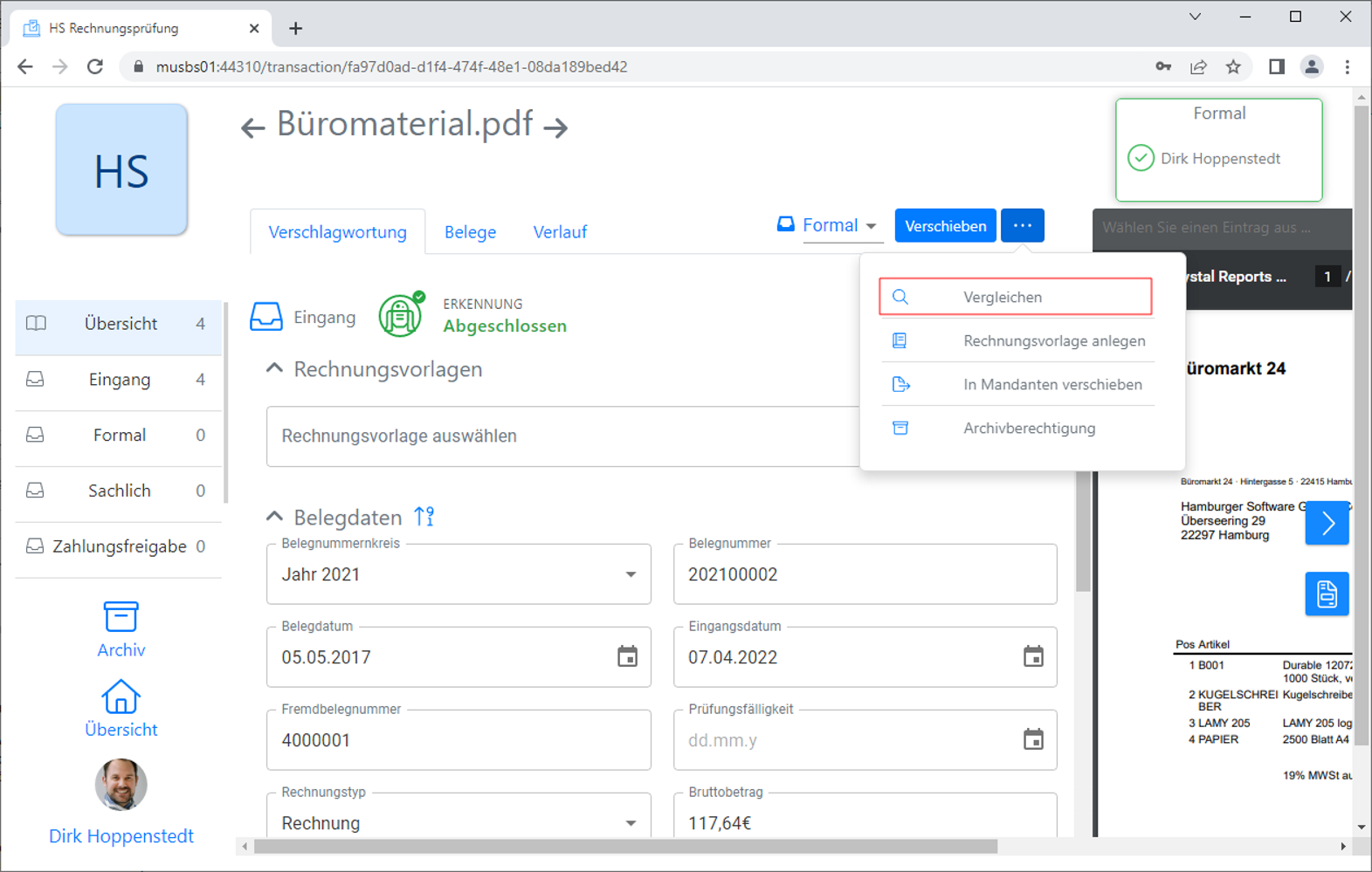 - Sie können die Vergleichsansicht entweder aus einer Liste oder aus der Einzelanzeige einer Rechnung aufrufen. Dazu klicken Sie auf die Schaltfläche